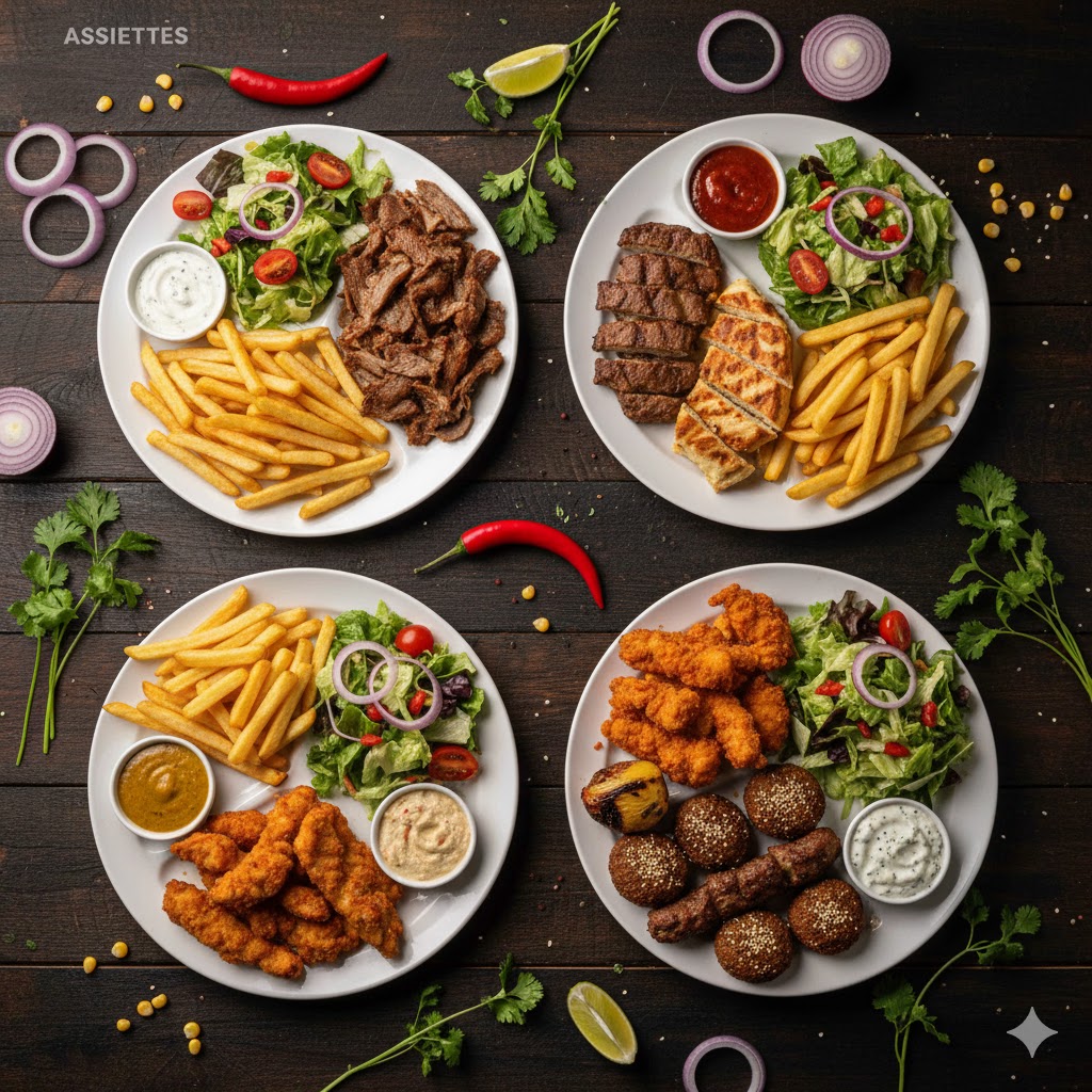 Choix de Viandes: Kebab, Merguez, Steack, Cordon Bleu, Chicken, Tenders, Falafel, Kefta.